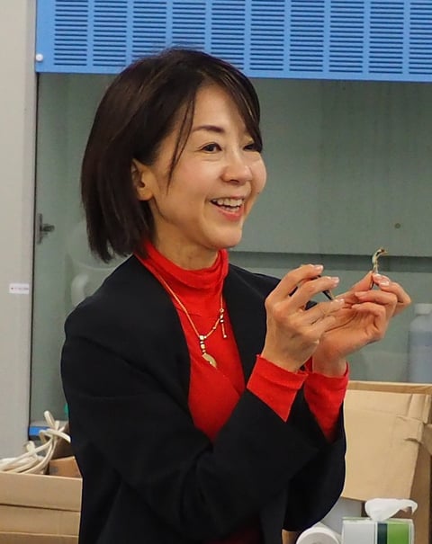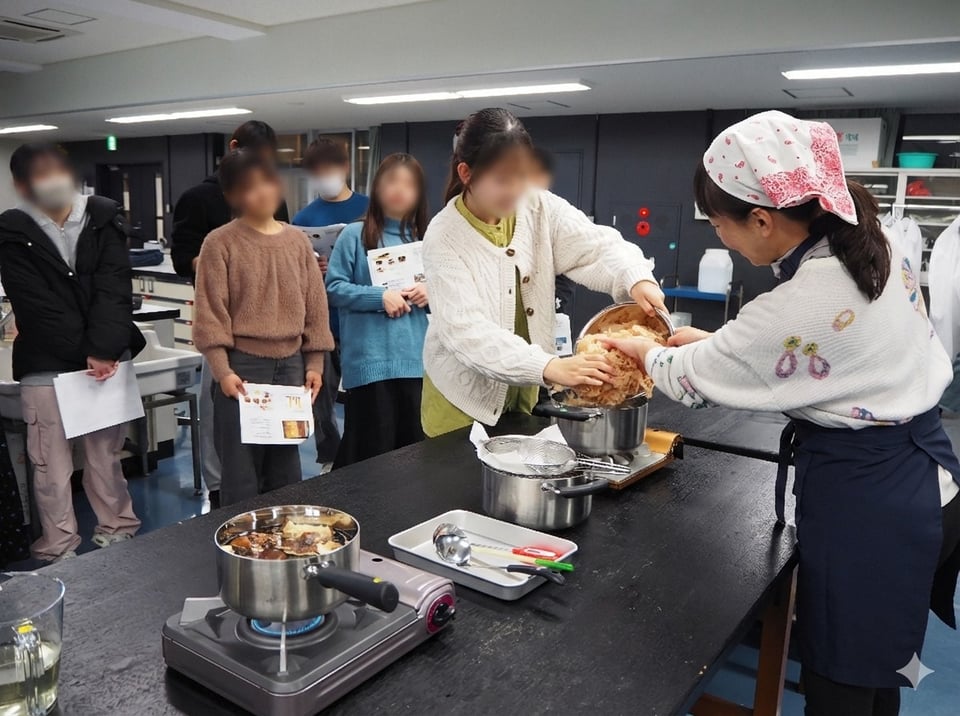 まずは、「おいしさとうま味の関係」や「食品中のうま味物質」などの基礎知識を説明。さらに、昆布、かつお節、干し椎茸、煮干しといった代表的なだし素材について、現物を見せながら説明しました。煮干しだしの下処理体験では、煮干しの頭やはらわたの取り方がわからず、「粉々になってしまう」と戸惑う声も上がりましたが、コツをつかむとスムーズにできるようになっていました。だし取りの実演では、学生たちがだしの香りを確かめながら、科学的根拠に基づいた素材ごとに異なるだしの取り方を学びました。